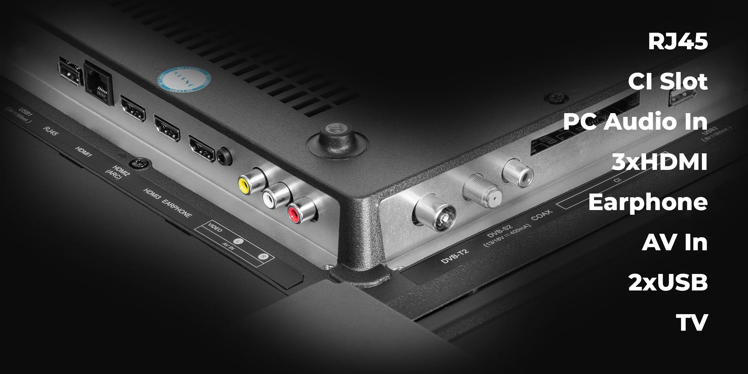 CONNECTOR: RJ45, CI-Steckplatz, PC-Audioeingang, 3xHDMI, Kopfhörerausgang, AV-Eingang, 2xUSB, TV